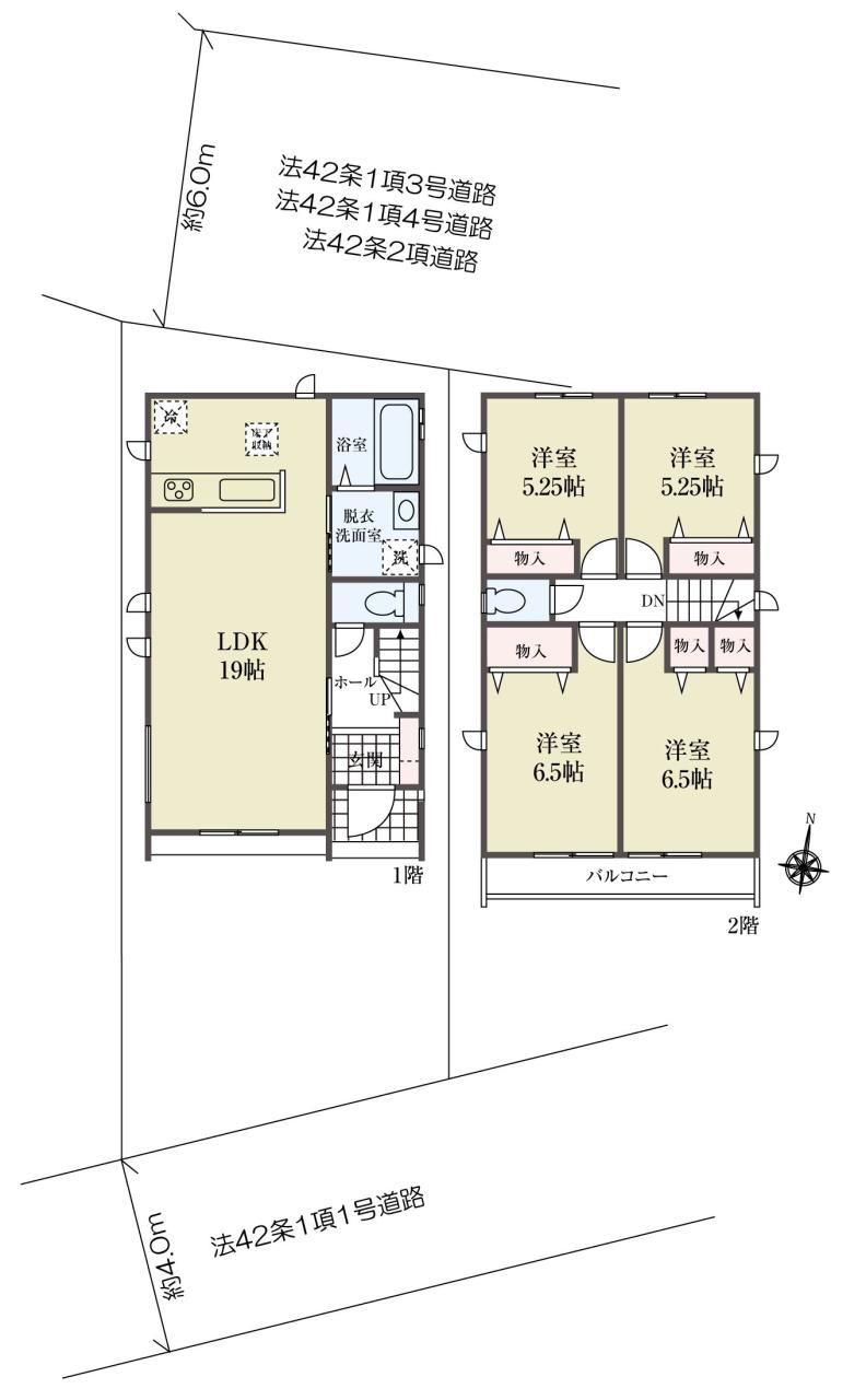 ・北側公道6メートル、南側公道4メートルに面しており、日当たり通風良好