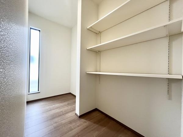 〇B号棟キッチン後ろにはパントリーがある家事ラクプランです。