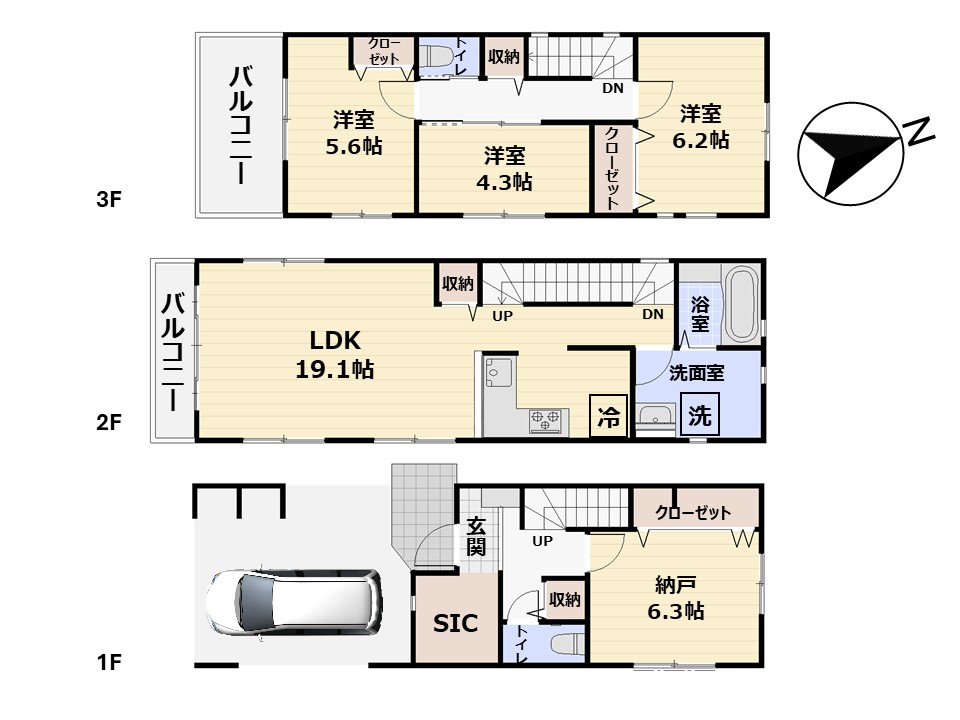 | 建物面積 | 129.72m2(39.24坪) うち1F車庫 面積:12.43m2 |
