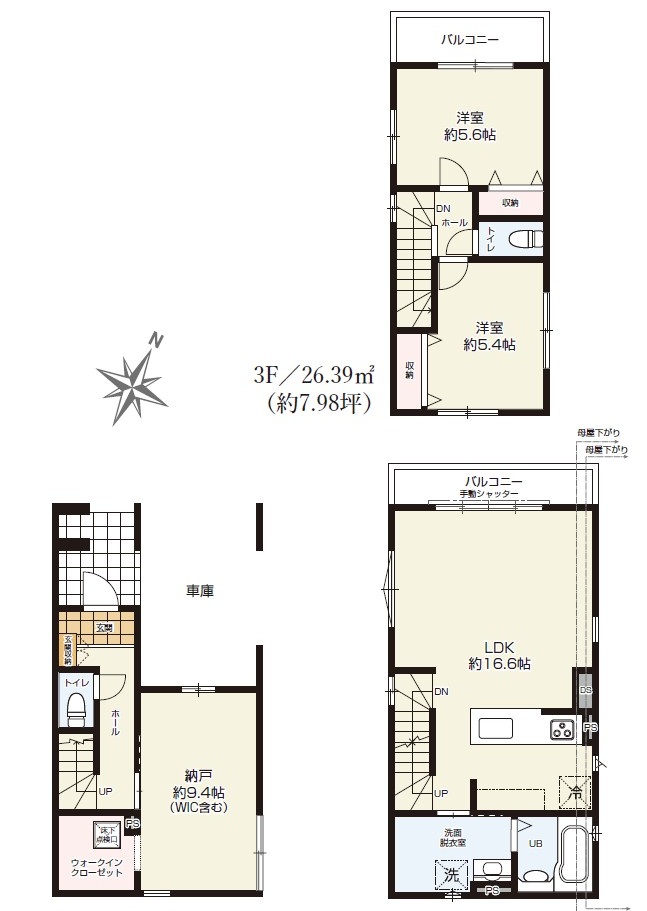 | 建物面積 | 107.53m2(32.52坪) うち1F車庫 面積:13.66m2 | ||