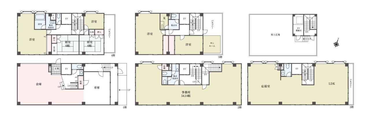 ・1階部分は車庫や倉庫として、2階部分は事務所、3階から5階は居室としてご利用いただけます