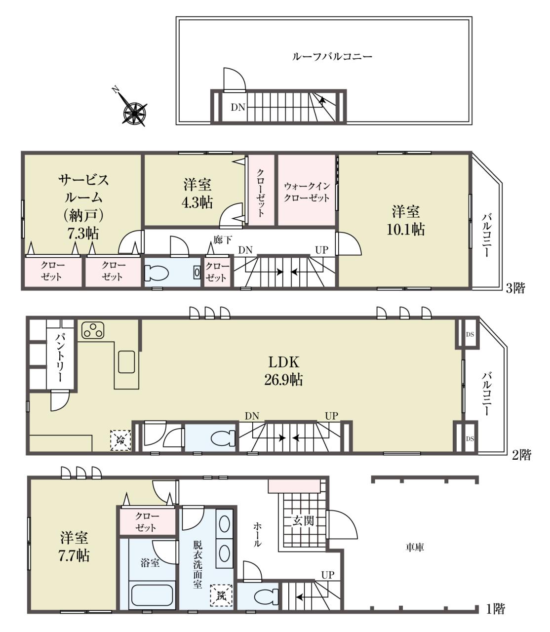 | 建物面積 | 173.57m2(52.5坪) うち1F車庫 面積:15.13m2 |