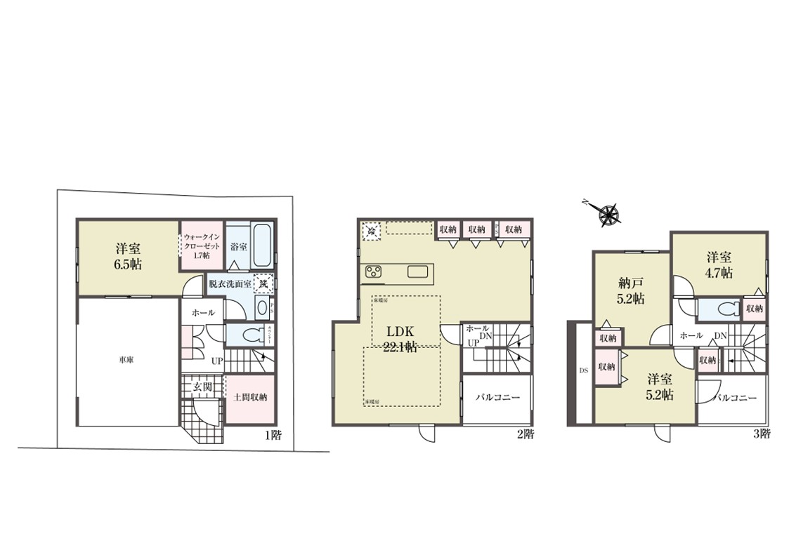 各部屋収納、リビング収納、土間収納、ウォークインクローゼット