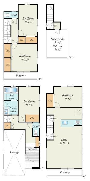 | 備考 | 第KS126-3120-52384号 他 準防火地域、第2種高度地区、【車庫面積】15.79平米(1号棟)・18.22平米(2・3号棟) | ||