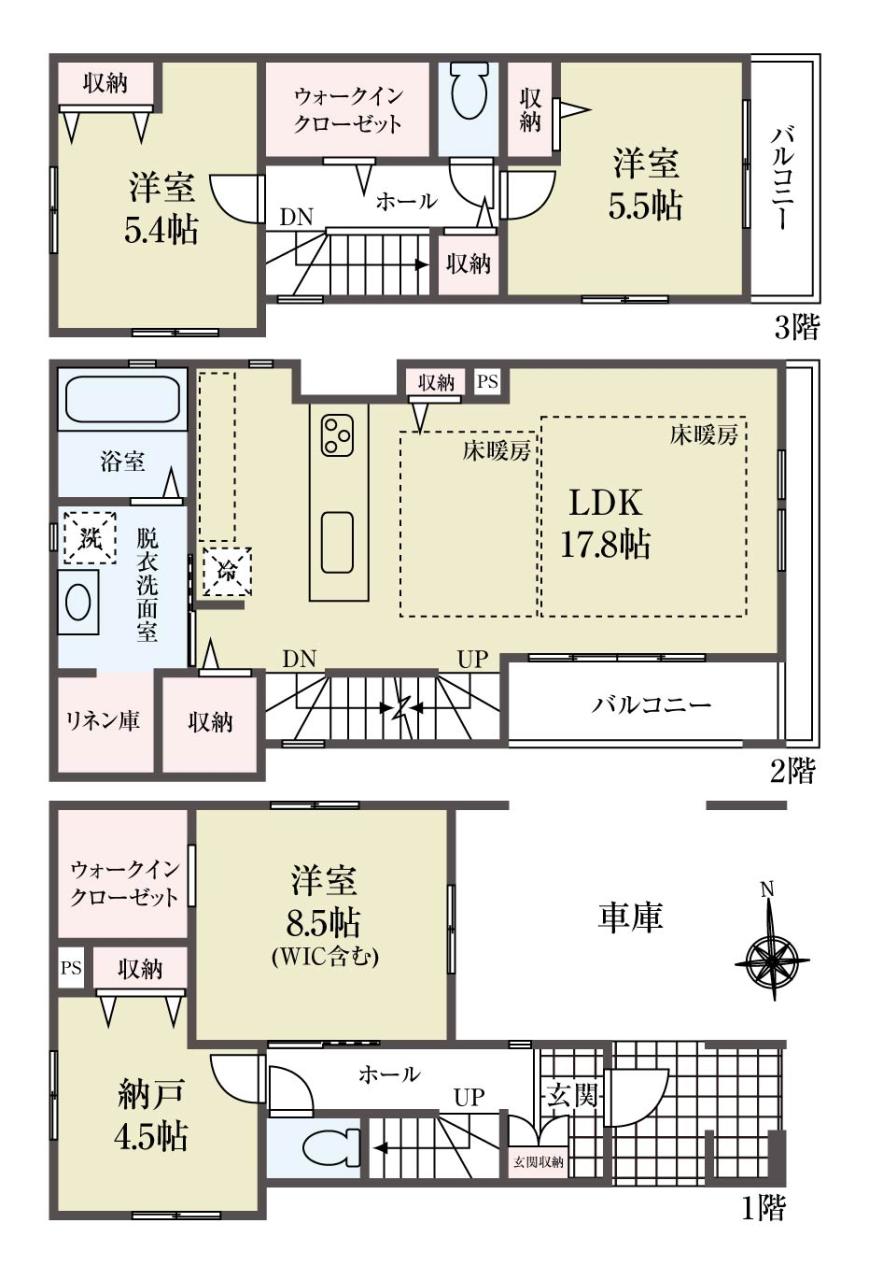 | 建物面積 | 127.68m2(38.62坪) うち1F車庫 面積:15.21m2 |