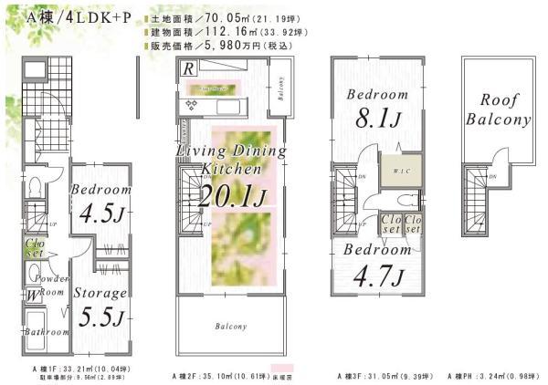 建物面積 | 112.16m2(33.92坪) うち1F車庫 面積:9.56m2 |