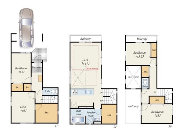 建物面積 | 117.58m2(35.56坪) うち1F車庫 面積:4.98m2 |